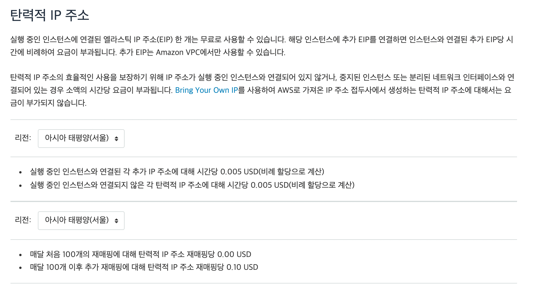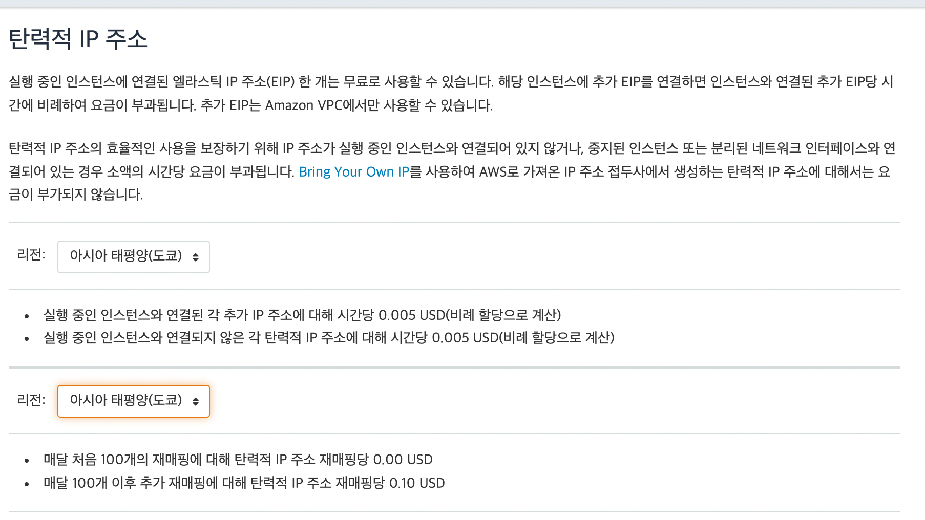 EC2 -> 왼쪽 메뉴 네트워크 및 보안 - 탄력적 IP -> 탄력적 IP주소 할당 -> 할당 -> 탄력적 IP주소 연결 -> 인스턴스 연결 -> 프라이빗IP 선택 -> 연결